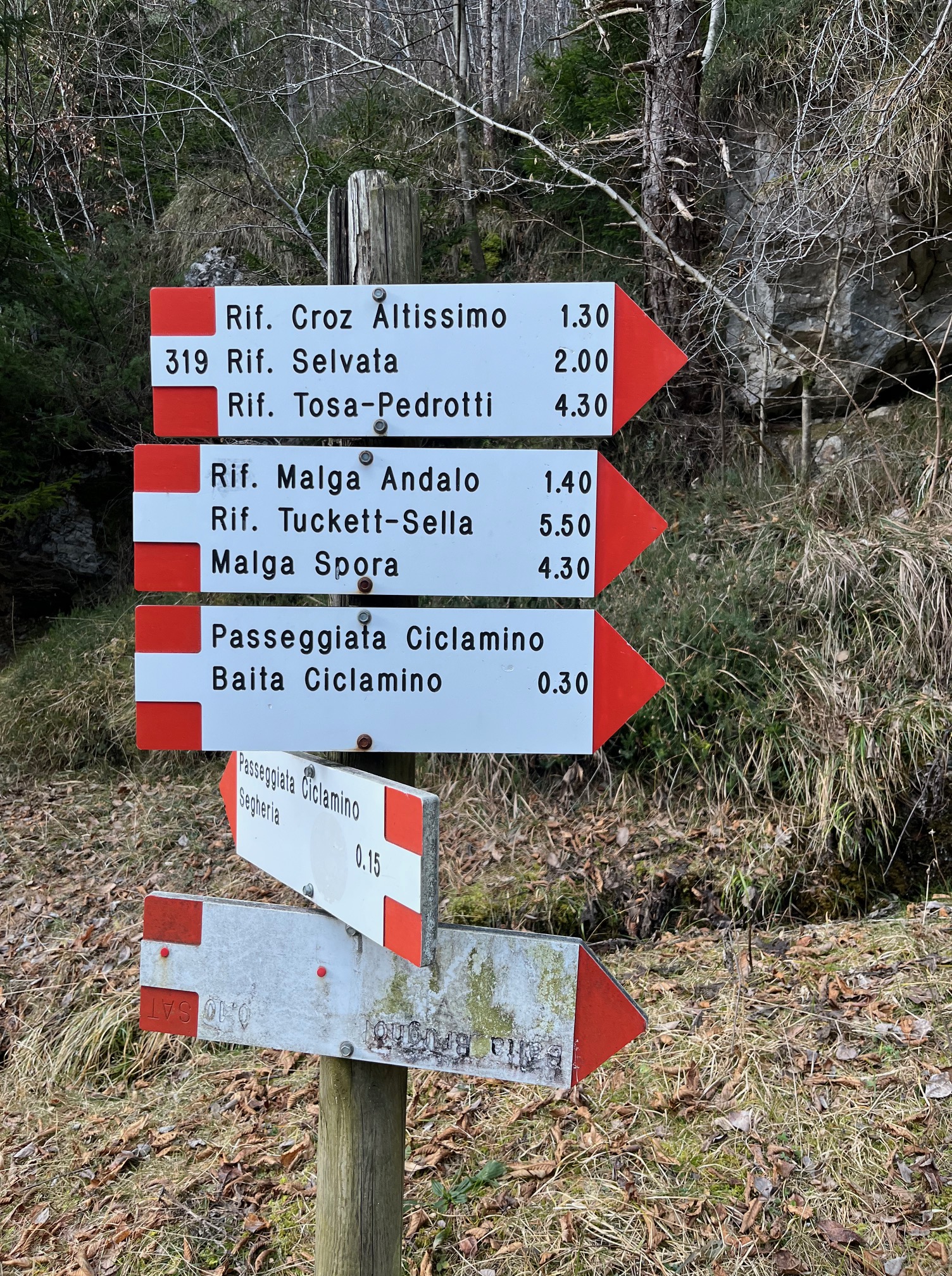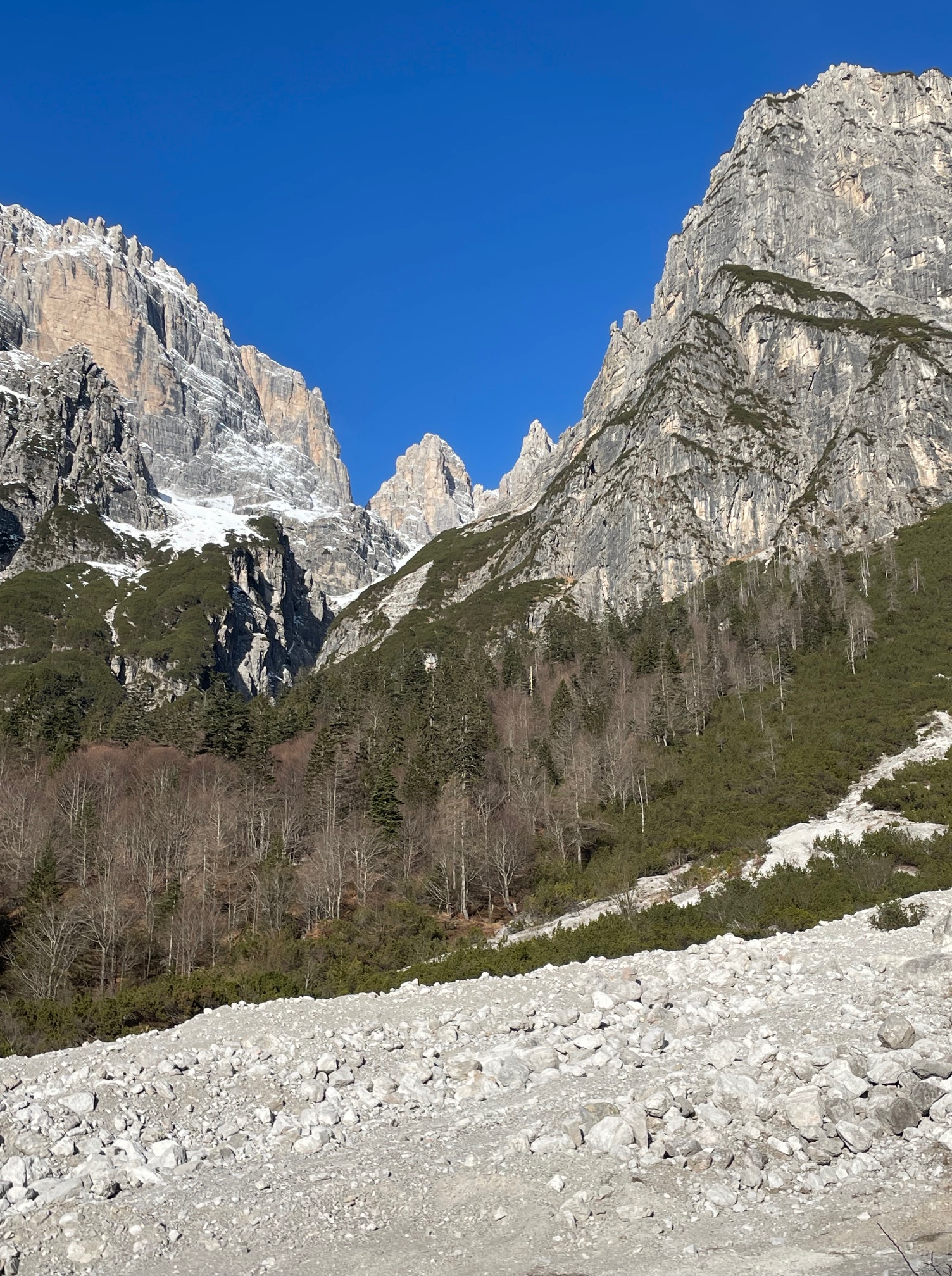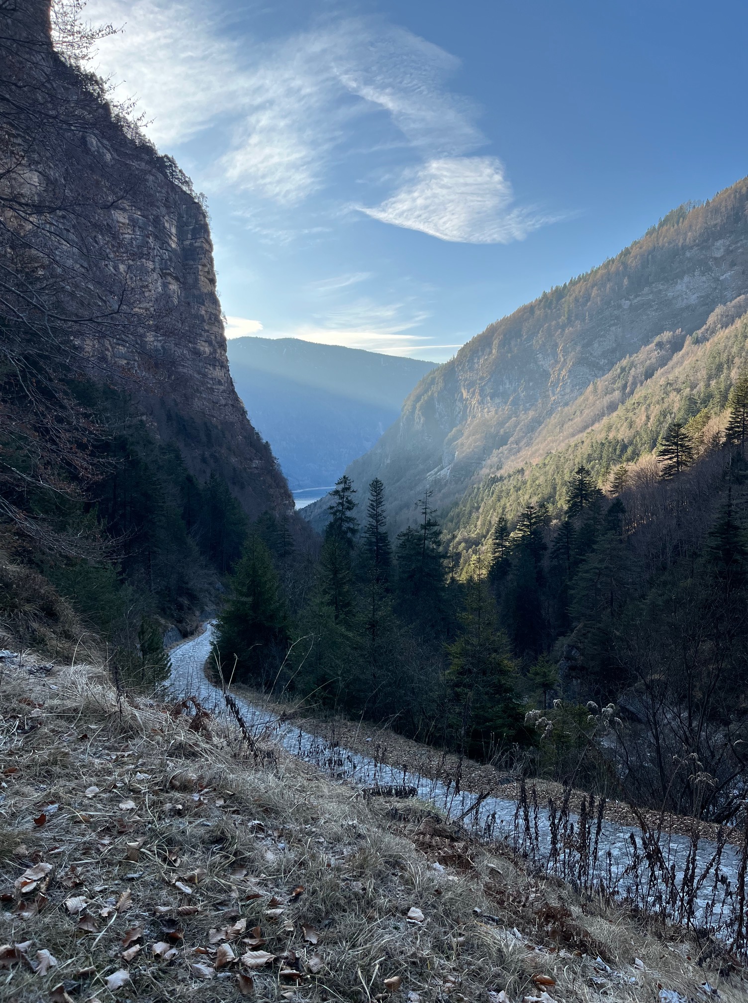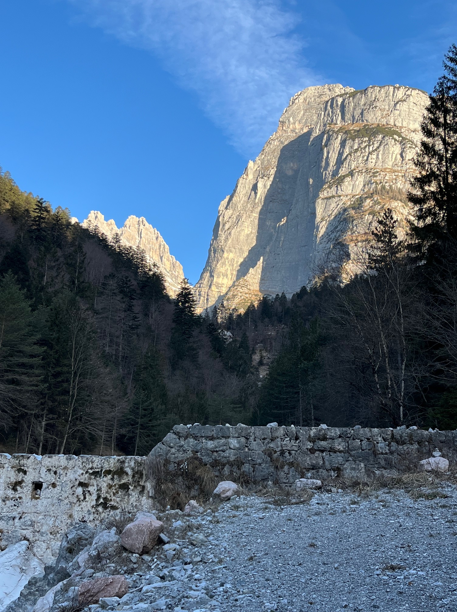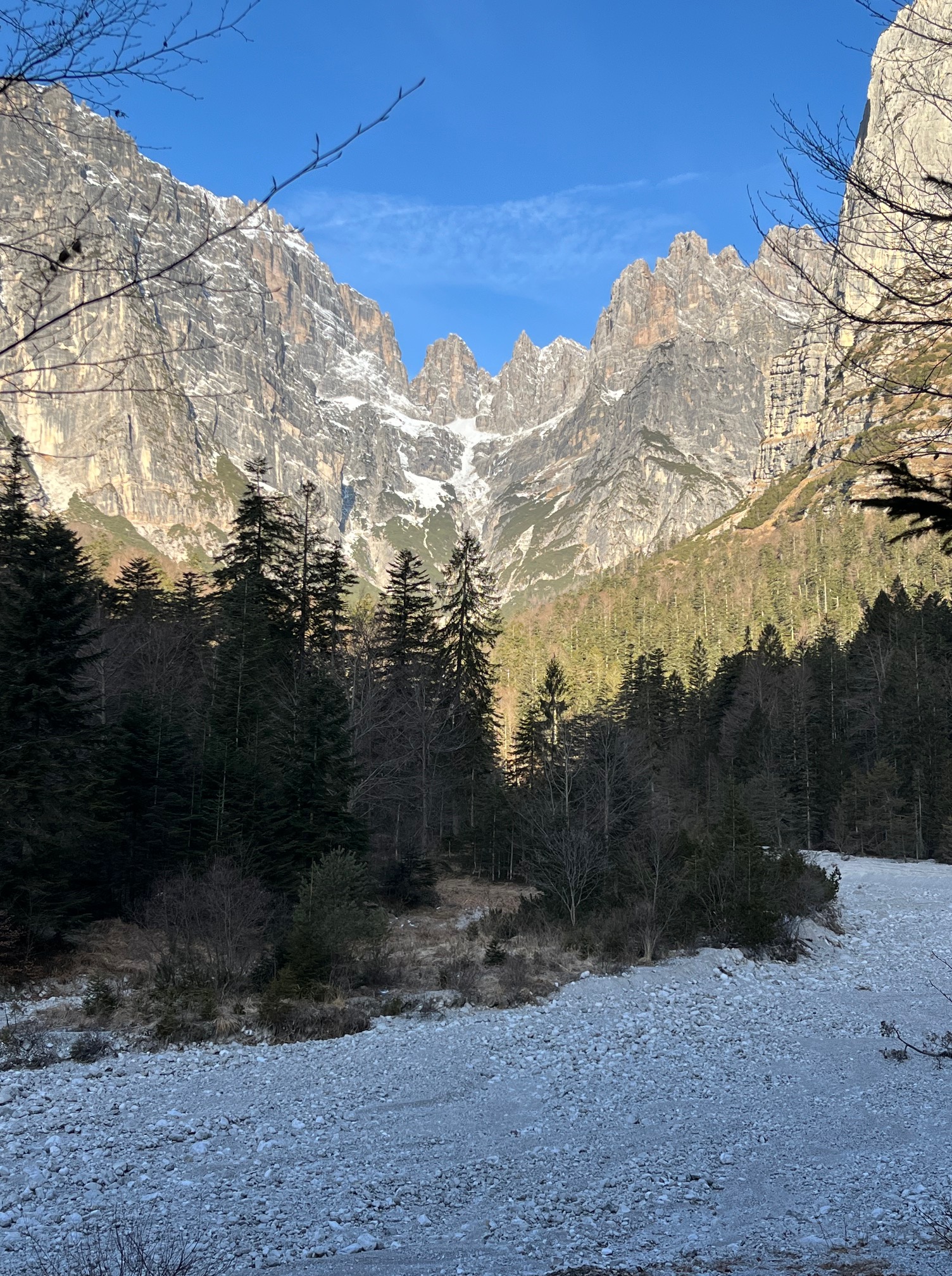 Für diesen Sommer haben wir uns vorgenommen, ein für uns neues Gebiet zu erwandern: Im Inneren des Brenta Massivs wollen wir unsere Prämiumtour machen. Unsere Wanderung soll in Molveno losgehen, über die Valle delle Seghe geht es dann hoch zum Rifugio Tosa Pedrotti und dann durch Valle di Brenta Alta bis zum Rifugio Maria e Alberto ai Brentei. Wie meist bei unserem neuen Touren forschen wir vorher so viel wie möglich aus. Es ist jetzt schon Jänner und so gut wie kein Schnee auf den Bergen aber viel gefährliche eisige Passagen auf den Wanderwegen. In den nächsten Tagen soll es endlich Schneefall geben und da kann es möglich sein, dass man lange nicht mehr in dieser Gegend ohne spezielle Tourenskiausrüstung hochsteigen kann. Wir erkunden heute mal die Strecke von Molveno bis zum Rifugio Croz dell`Altissimo. Von hier aus gibt es dann im Sommer drei Varianten um in der Bergwelt der Brentaguppe einzusteigen. Es ist ein herrlicher Wintetag, kalt aber mit einem wunderbaren blauen Himmel, schon eher kitschig blau. Wir konnten alle nötigen Informationen für unser Vorhaben sammeln und haben noch dazu eine schöne leichte Wanderung in diesem schönen Tal unter der enormen Wand des Croz dell Altissimo gemacht.