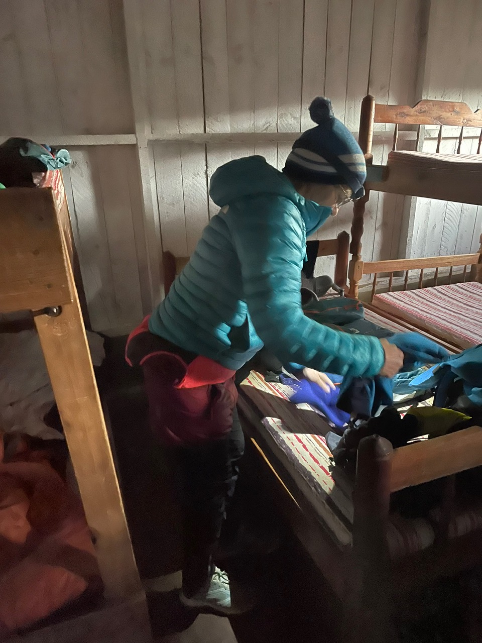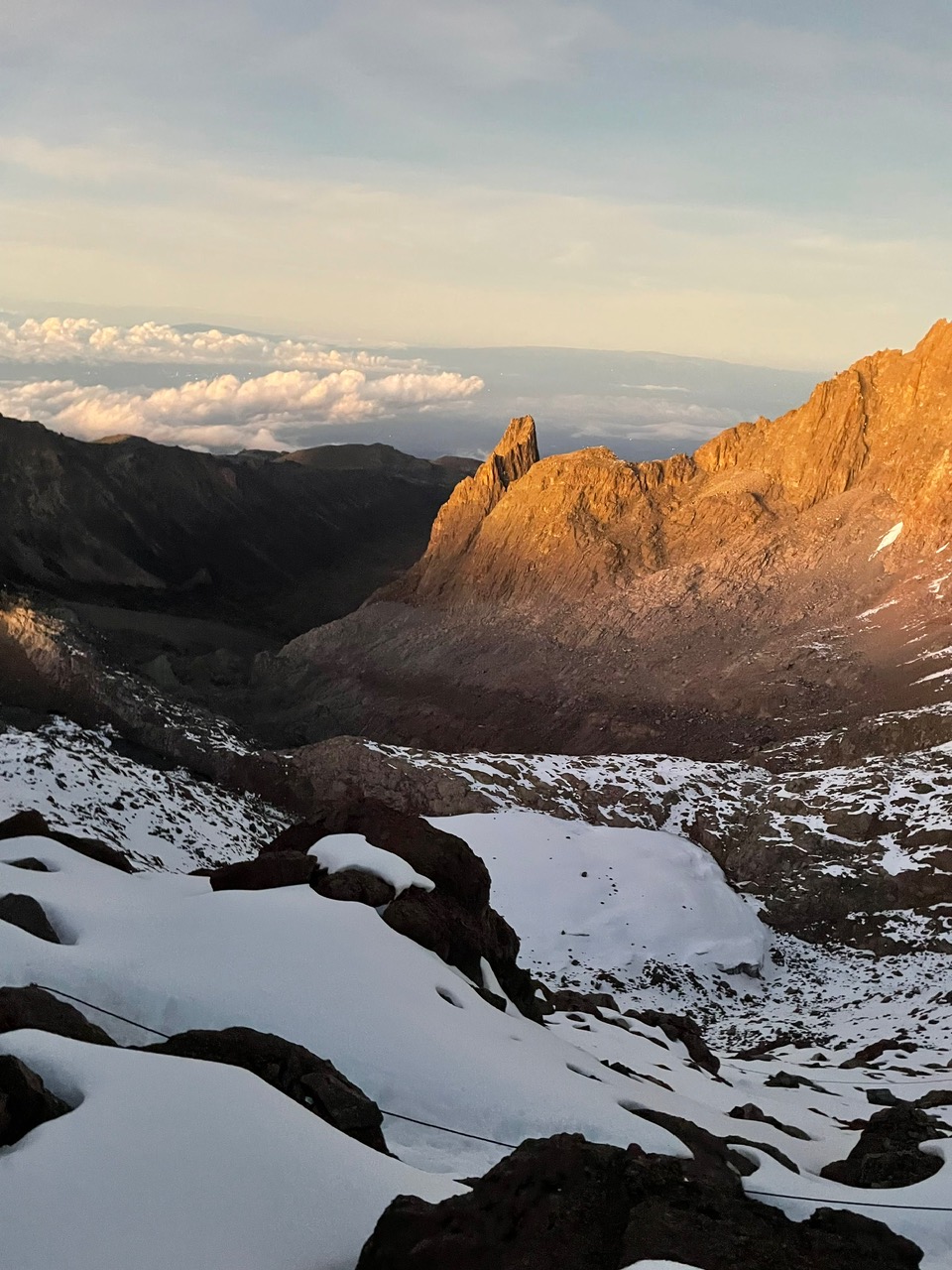 Als gegen vier Uhr die Sonne untergeht, zieht ein böiger Wind vom Osten her auf und in kurzer Zeit ist das ganze Massiv mit dunklem Nebel umhüllt. Dann bei Eintritt der Dunkelheit das Abendessen, noch die Rucksäcke für den Gipfelanstieg nur mit dem Notwendigsten packen. Gegen halb sieben packten wir uns in die Schlafsäcke ein. Inzwischen hat der Wind hefitg zugenommen, aber es war wolkenlos, am Himmel ein Sternemeer. Dann nach ungefähr einer halben Stunde ist noch eine Gruppe an der Hütte angekommen. Es war eine der Spanierinnen die nachgestiegen ist und auch um drei Uhr Morgens dann zum Gipfel aufbrechen wird. Wir brauchten dann doch eine Weile bis wir endlich geschlafen haben. Gegen Mitternacht wurde der Wind noch heftiger, ich dachte schon jetzt kommt ein neues Problem beim Aufstieg dazu, aber als Segler und Windsurfer habe ich gelernt die Abstände zwischen den Windböen zu beobachten und ich merkte dass er regelmässig nachlies und die Abstände größer wurden, es hat mich beruhigt und ich bin noch einmal eingeschlafen. Dann so um zwei Uhr hörten wir unsere Gruppe aufstehen und das Frühstück vorzubereiten.