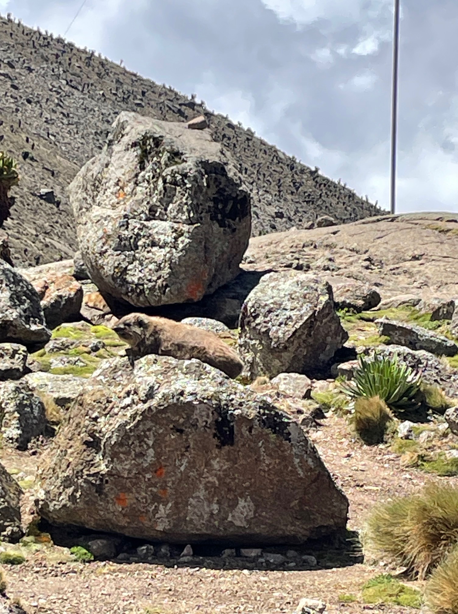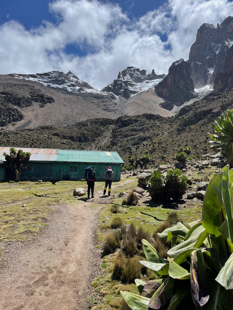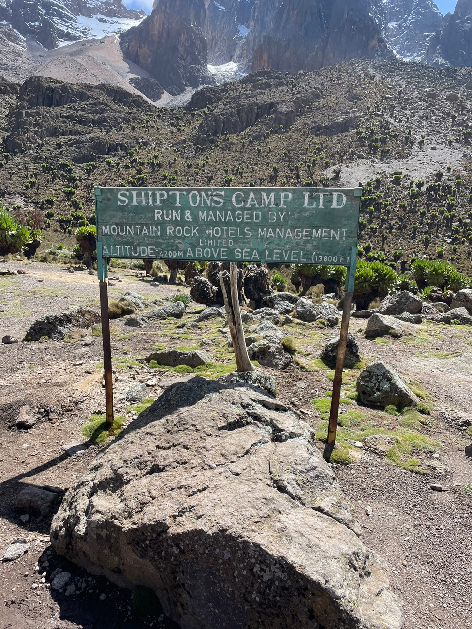 Von unserem Team war noch keiner angekommen, Wette gewonnen. Sie trafen nach und nach mit langen Gesichtern ein. Das Wetter meint es gut mit uns, immer noch blauer Himmel hier am Camp, es liegt direkt am Fusse des Bergmassivs am Talschluss. Die ersten Kehren des finalen Aufstiegs sind erkennbar, ungefähr kann man sich die Route ausdenken: Machbar!! Der Camp scheint uns eigentlich gar nicht so übel, wie es uns berichtet wurde. Die Schlafräume sind eindeutig besser isoliert, jeder hat eine eigene Toilette. Da wir heute die einzigen Übernachtungsgäste sind lässt uns Bernard den Raum aussuchen. Wir nehmen einen wärmeren, sogar mit Isolierpannelen verkleideten Raum. Auch die Matrazzen sind neuer und bequemer als am Old Moses Camp. Im Essenstakt gibt es einen Kaminofen, der aber seit längerem nicht mehr benutzt wurde, schade. Jetzt legen wir mal alles was feucht ist in die Sonne und der leichte Wind hilft auch dass alles auf dieser Höhe noch trocknet. So ein Glück. Es gib hier am Gelände der Hütte kleine Tiere, die unseren Murmeltieren sehr ähnlich sind. Sie heißen Dassie ( Klippschliefer) sind gar nicht scheu hier, auch sie sonnen sich auf den warmen Felsen und beobachten uns neugierig. Jetzt haben wir sogar Zeit uns ein wenig mit unseren Helfern zu unterhalten, zeigen Ihnen Fotos von unserer Heimat mit den schönen Bergen und dem vielen Schnee und die vielen Gletscher, die auch leider immer weniger werden.