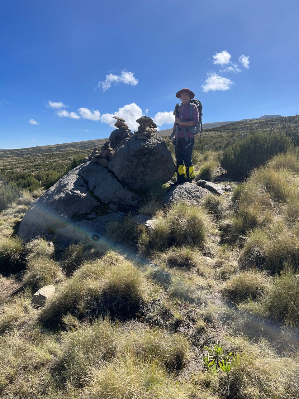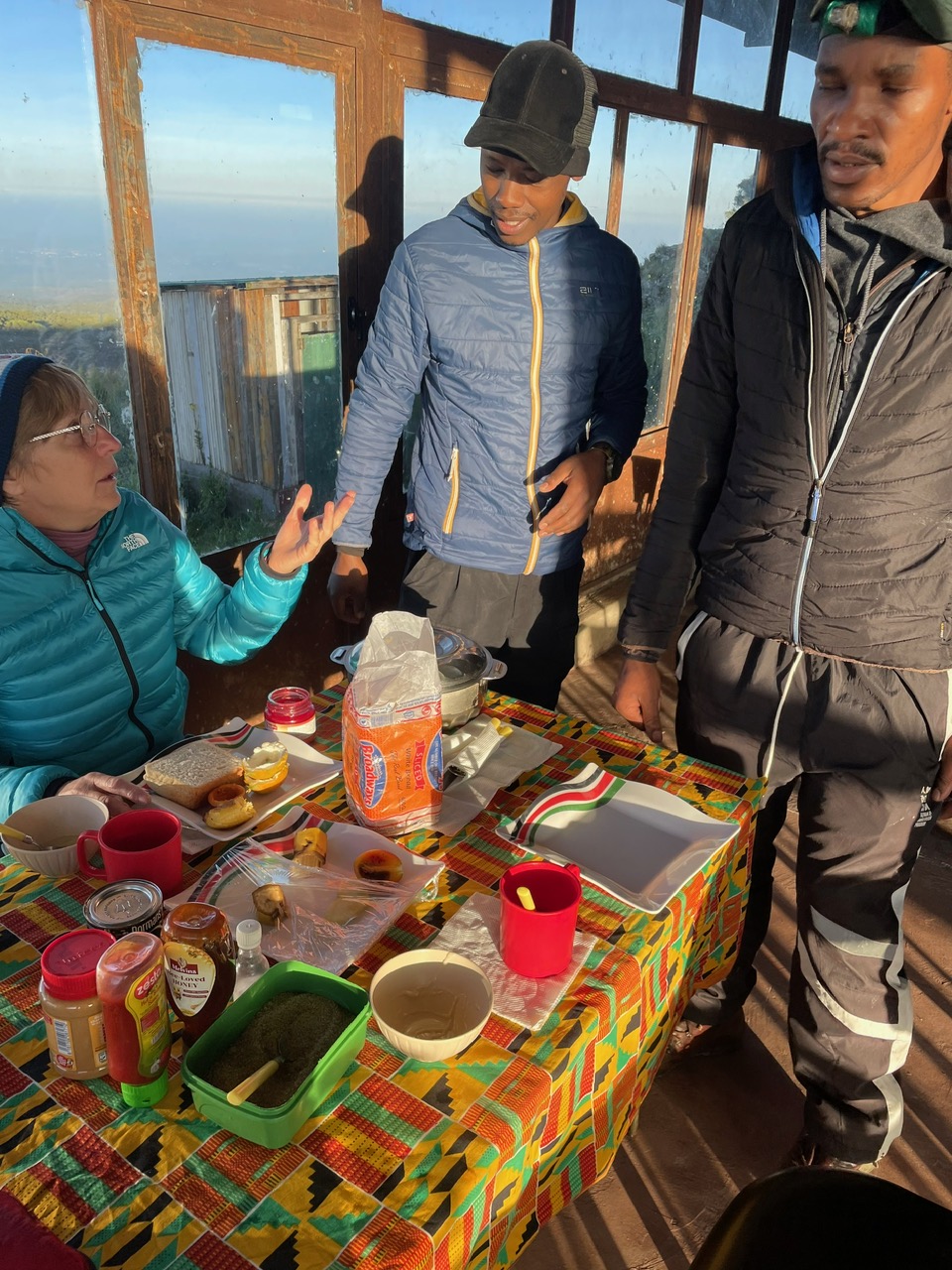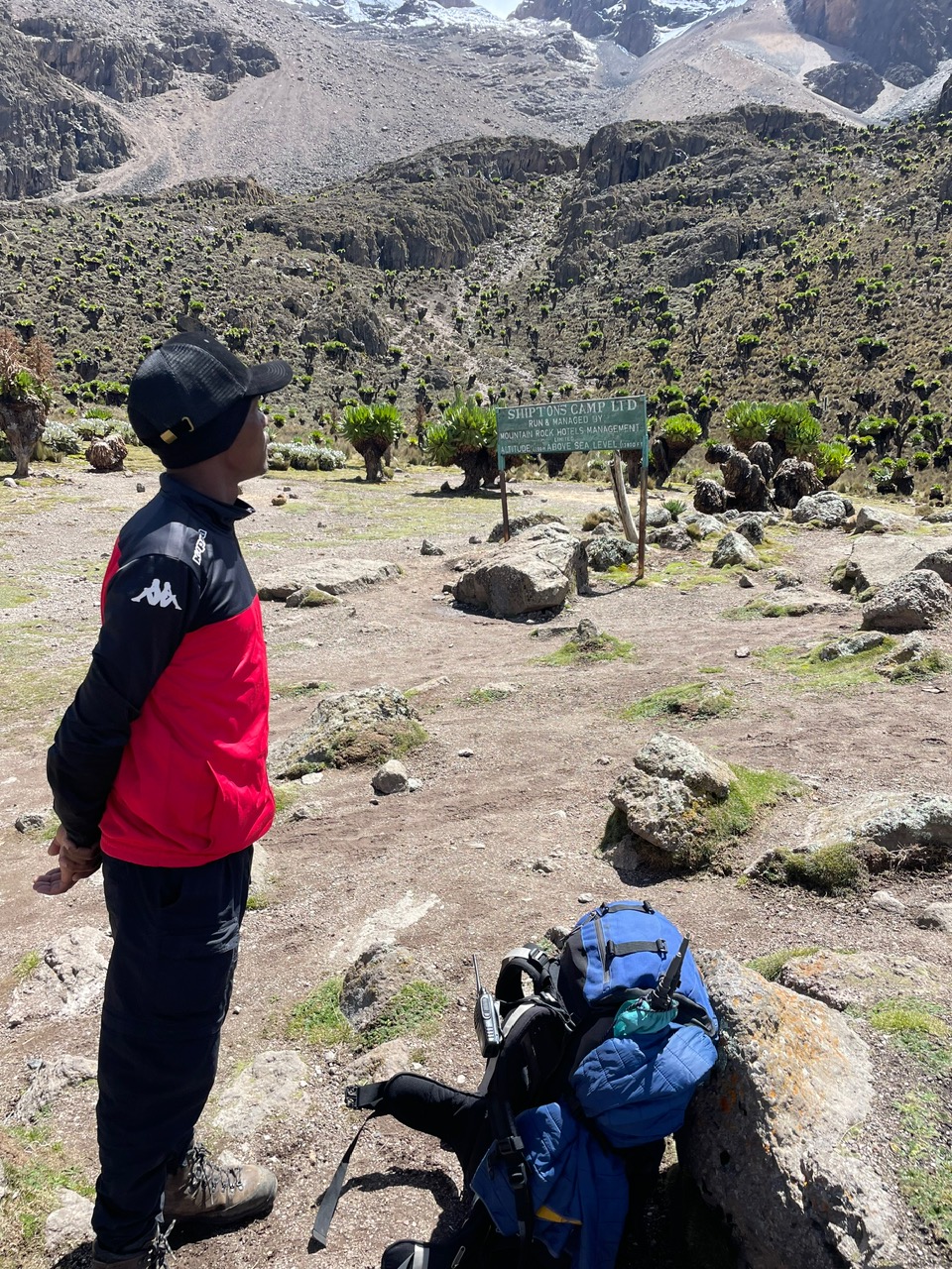 Von unserem Team war noch keiner angekommen, Wette gewonnen. Sie trafen nach und nach mit langen Gesichtern ein. Das Wetter meint es gut mit uns, immer noch blauer Himmel hier am Camp, es liegt direkt am Fusse des Bergmassivs am Talschluss. Die ersten Kehren des finalen Aufstiegs sind erkennbar, ungefähr kann man sich die Route ausdenken: Machbar!! Der Camp scheint uns eigentlich gar nicht so übel, wie es uns berichtet wurde. Die Schlafräume sind eindeutig besser isoliert, jeder hat eine eigene Toilette. Da wir heute die einzigen Übernachtungsgäste sind lässt uns Bernard den Raum aussuchen. Wir nehmen einen wärmeren, sogar mit Isolierpannelen verkleideten Raum. Auch die Matrazzen sind neuer und bequemer als am Old Moses Camp. Im Essenstakt gibt es einen Kaminofen, der aber seit längerem nicht mehr benutzt wurde, schade. Jetzt legen wir mal alles was feucht ist in die Sonne und der leichte Wind hilft auch dass alles auf dieser Höhe noch trocknet. So ein Glück. Es gib hier am Gelände der Hütte kleine Tiere, die unseren Murmeltieren sehr ähnlich sind. Sie heißen Dassie ( Klippschliefer) sind gar nicht scheu hier, auch sie sonnen sich auf den warmen Felsen und beobachten uns neugierig. Jetzt haben wir sogar Zeit uns ein wenig mit unseren Helfern zu unterhalten, zeigen Ihnen Fotos von unserer Heimat mit den schönen Bergen und dem vielen Schnee und die vielen Gletscher, die auch leider immer weniger werden.