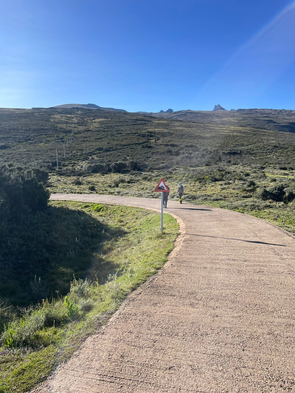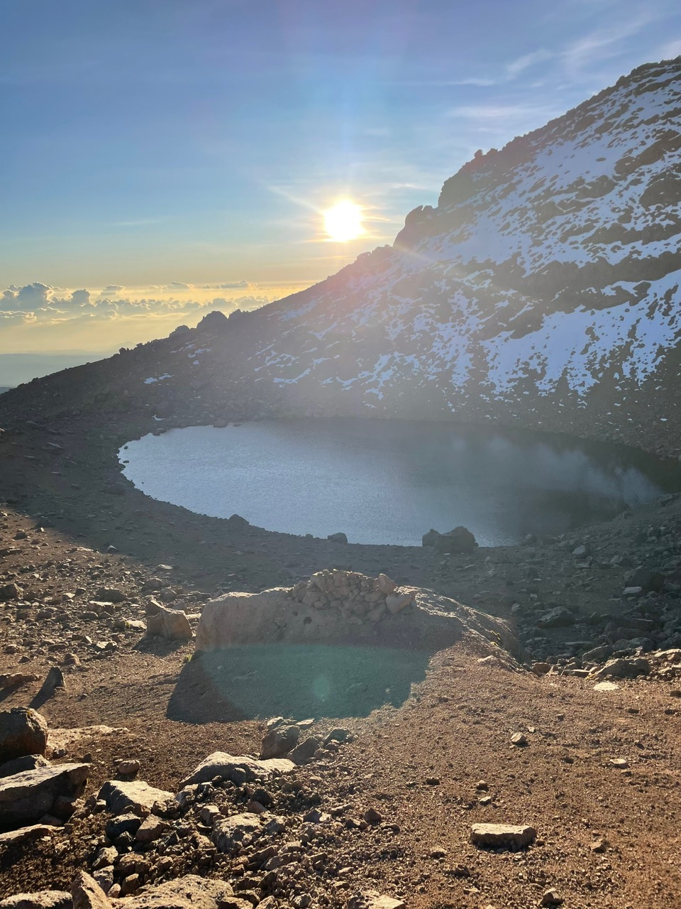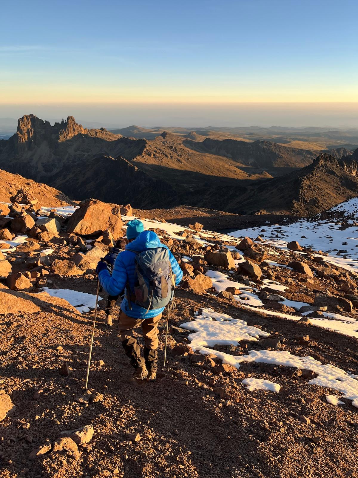 Vor dem Start zogen wir uns die Grödel für den Abstieg an, denn unter dem Schnee war es steinhartes Eis. Ich zeigte diese dem Bernard, der so etwas noch nie gesehen hat. Dann ging der Abstieg los. Da zeigten wir aus welchem Holz wir geschnitzt ,sind meinte Marion, mit Stöcken und Grödeln ging es den Serpentinen entlang runter. Nur beim Einstieg in den Kletterteil hielten wir an, weil die Sonne aufging und wi auch gerade eine größere Gruppe beim Aufstieg begegneten, sie kamen von der Chogoria Route her hoch. Beim See machten wir auch noch einige Aufnahmen, jetzt konnten man ihn auch besser sehen. Bei Tageslich sehen wir, dass die Aufstiegsroute gar nicht schwierig oder gefährlich war. Nach dem Seee habe ich dem Bernard kurz die Grödeln zum Testen überlassen. Er zeigte sich begeistert von diesen Geräten um so mehr war er erfreut, als Ich Ihm sagte bei dem Camp bekommt er unsere beiden Paare geschenkt. Jetzt liesen wir uns nicht mehr bremsen. Für den Abstieg brauchten wir etwas mehr als eine Stunde, um viertel nach sieben waren wir am Shiptons Camp.