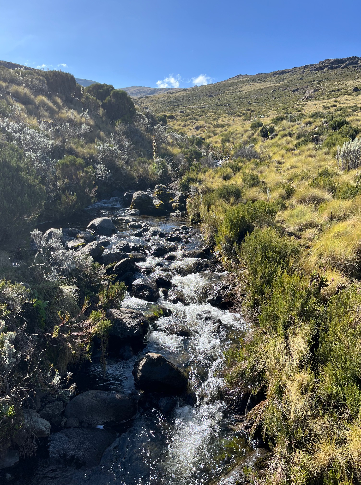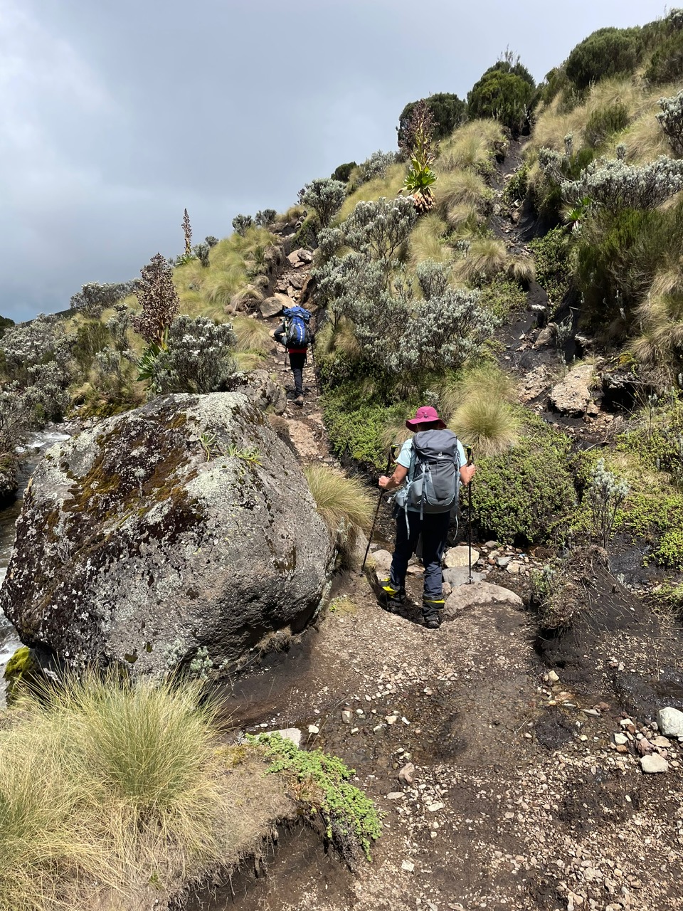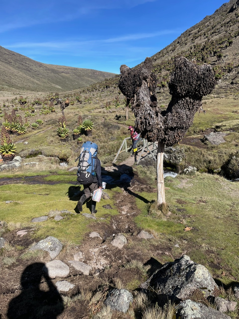 2. Tag : Old Moses Camp 3384m – Shiptons Camp 4260m : 16 Km Treck durch das Moor über den Likii Pass und Fluss und über den Nanyuki Pass und durch das Nanyuki Tal. Start 07:30 – Ankunft zirka 16:30