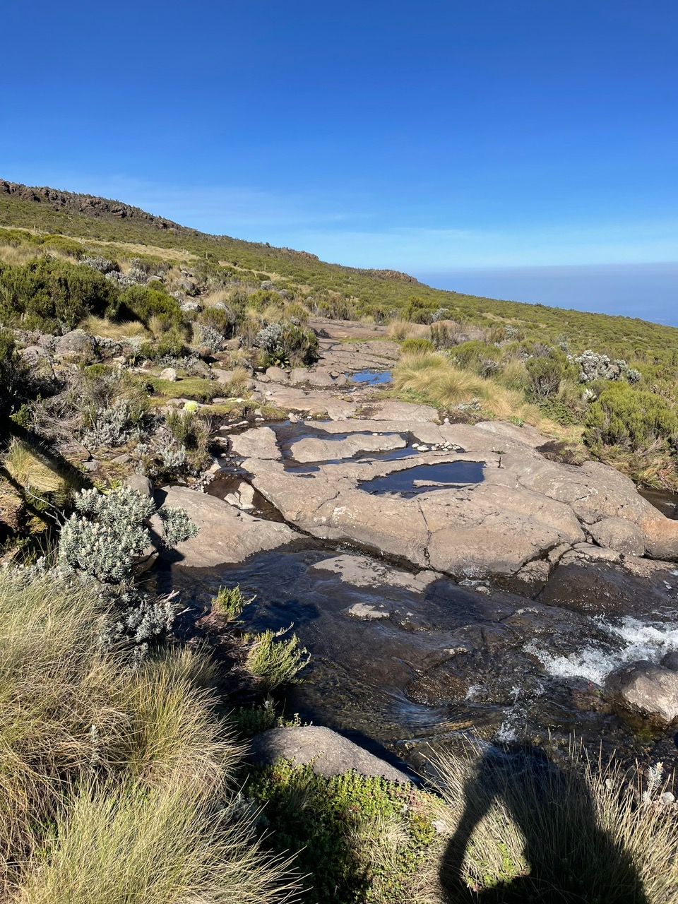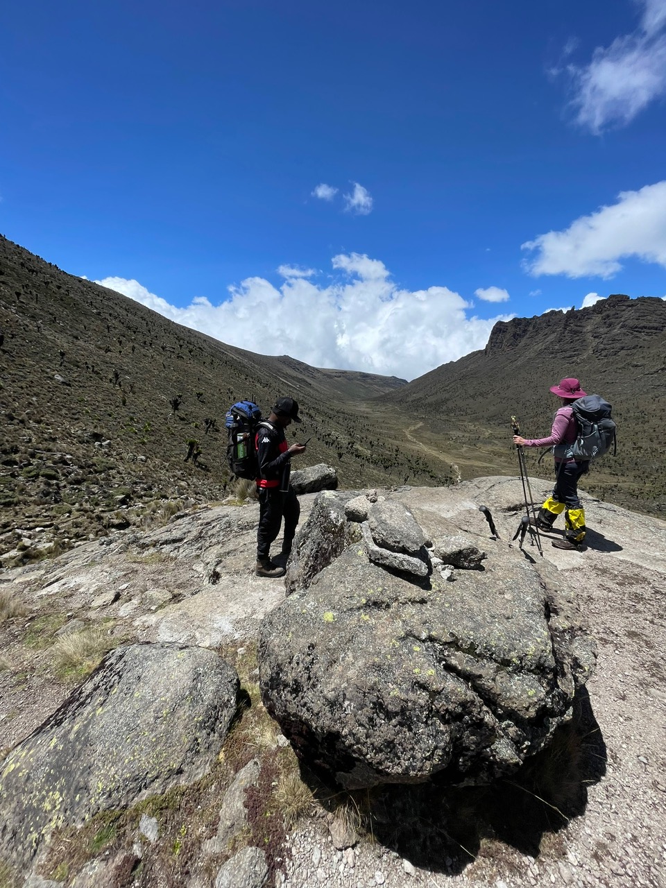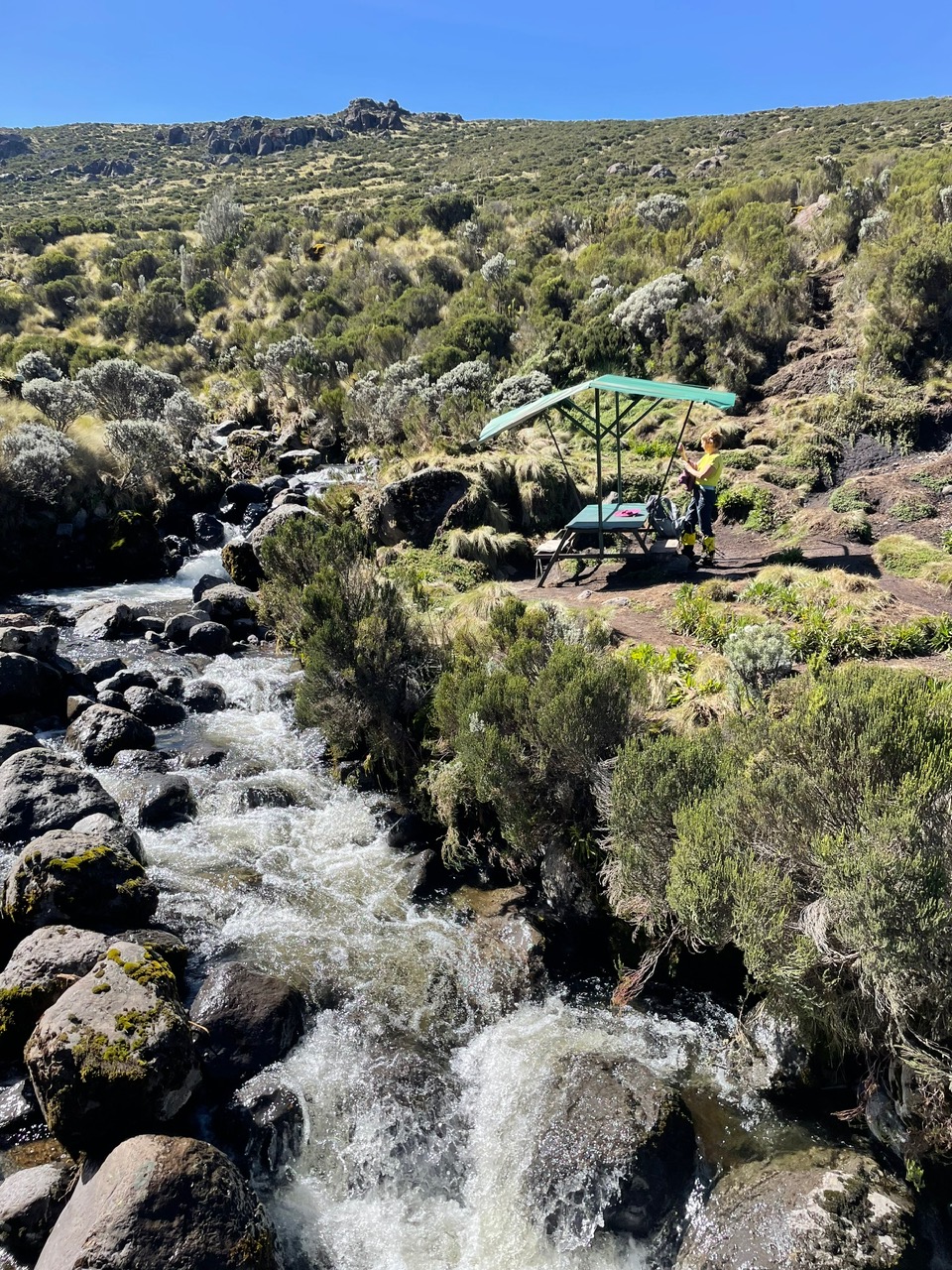 2. Tag : Old Moses Camp 3384m – Shiptons Camp 4260m : 16 Km Treck durch das Moor über den Likii Pass und Fluss und über den Nanyuki Pass und durch das Nanyuki Tal. Start 07:30 – Ankunft zirka 16:30