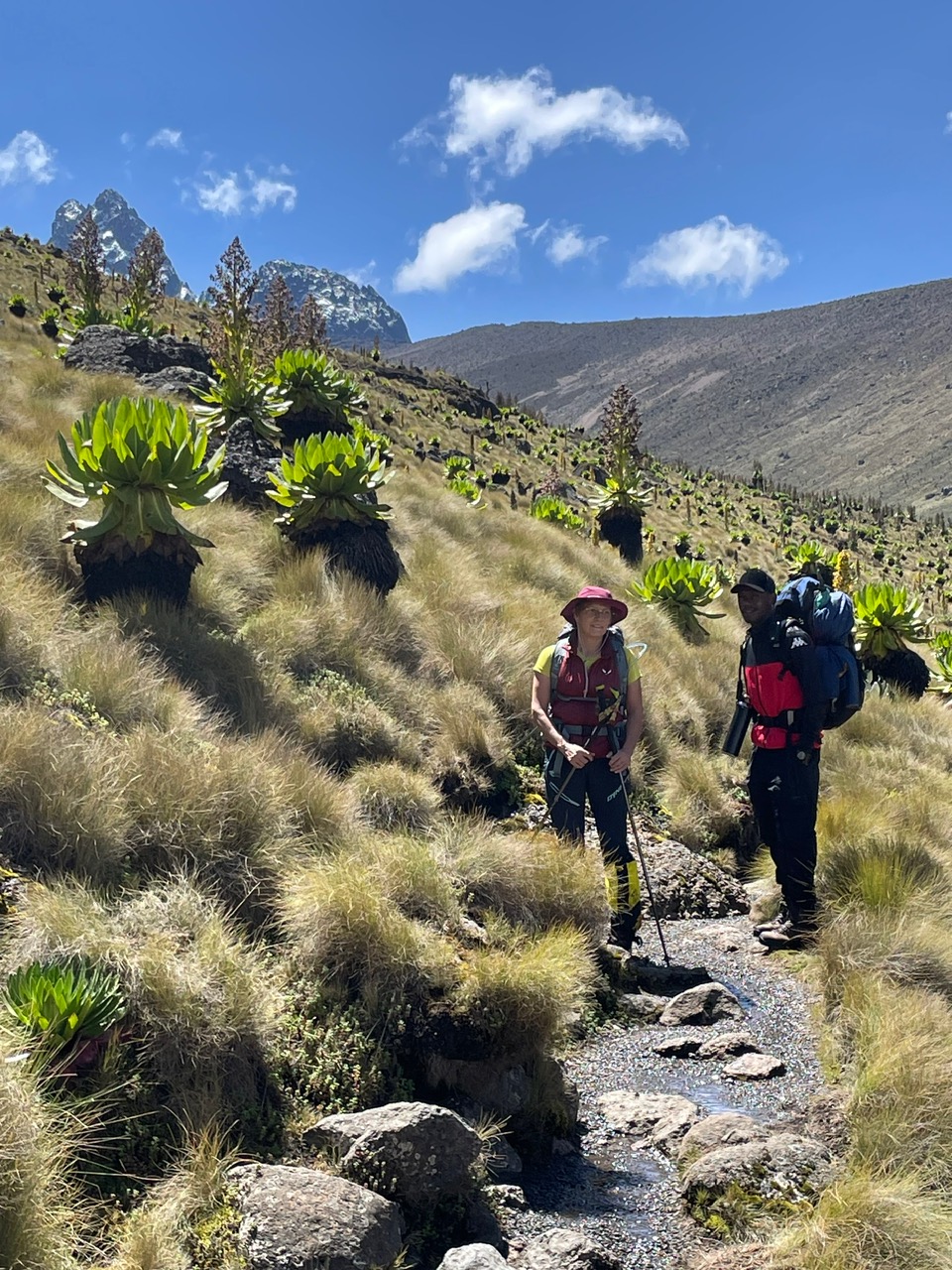 Gegen sechs Uhr morgens war es wolkenlos, in Richtung Osten glühte es rot, kurz vor Sonnenaufgang. Der Marion ging es auch gut, wir freuten uns auf das Frühstück. Es war lecker, und reichlich wir essen aber eher wenig, da wir uns eher schwer tun mit vollem Magen zu wandern. Dann wurde uns ein Lunchpaket für die Mittagspause unterwegs mitgegeben, jetzt Rucksäcke packen und die richtige Kleidung anziehen. Die Österreicher hatten uns zu guten wasserfesten Schuhen geraten. Die zogen wir an und die Gamaschen darüber wegen dem Moor, natütrlich hatten wir keine Ahnung was uns erwartete. Dann beim Einpacken unserer Schlafsäcke gab es noch einen Schreckensmoment. Wir hatten etwas Mühe beim Einpacken, wie man so oft in Berichten liest, in der dünnen Luft bekommt man Schwierigkeiten bei einfachen Dingen, wie Knöpfe zumachen oder Reisverschlüsse schliessen . Ich hielt etwas inne und musste mich stark konzentrieren. Marion ging es noch schlechter, sie bekam starke Kopfschmerzen, wie bei einem starken Mirgäneanfall. „Wenn das so schlimm ist müssen wir abbrechen und absteigen sagte ich gleich“. Doch schon nach einigen Minuten war der Schmerz weg, so wie er gekommen ist. Wir warteten noch eine Weile und entschieden dann mal zu starten. Sollte ihr wieder schlecht werden, würden wir abbrechen. Ich plazierte mal die notwendigen Medikamente für so einen Fall griffbereit im Rucksack. Dann pünktlich vor halb acht Uhr waren wir startbereit. Bei den beiden Spanierinnen, die auch losgehen sollten gab es auch ein Problem, eine hatte Magenprobleme und musste leider absteigen. Wir wünschten den beiden noch viel Glück , schade ist es schon aber Gesundheit geht vor dachte ich. Die Österreicher wünschten uns auch viel Glück beim Aufstieg und dann ging es los zum Shiptons Camp. Vor dem Start bot ich unserem Guide noch eine Wette an und zwar, daß die Träger uns bis zum Camp nicht einholen werden, wenn sie sich zu viel Zeit lassen. Er winkte ab, das wird nicht passieren meinte er ganz sicher. Das Camp liegt zwar „nur „890m höher, aber durch das Auf und Ab bei den Pässen sind doch über 1100 Höhenmeter zu überwinden. Die erste halbe Stunde ging es gleichmäßig hoch bis zur Sternwarte wo auch eine Stromleitung hinführte, dann überquerten wir ein Hochland mit hohen Grasschopfen, viel Wasser und Moor. Marion erwischte gleich so ein Loch und versank trotz Stöcke bis zu den Knien. Zum Glück wurden wir gewarnt, die Schuhe mit den Gamaschen haben sich gleich bewährt, soweit blieb sie noch trocken. Auch das Wetter zeigte sich nur von der besten Seite. Auf einer Höhe von 3700m überquerten wir dann über eine schön gebaute Brücke den Fluss Likii. Danach fühlten wir uns beide in unserem Element, ich weiß nicht wie ich das erklären soll, nach monatelanger Vorbereitung mit der Ungewissheit wie wir es in dieser Höhe schaffen werden. Die ganze Landschaft um uns herum spiegelte unser Glück wider, ich sah, wie sich Marions Gesicht erhellte, hörte sie dauernd sprechen, es taugte ihr. Alles an diesem stralhenden Vormittag war so frisch und sauber nach dem Regen. Jetzt marschierten wir den Ufern des Bachs entlang der gleichmässig von Osten nach Westen führte. Beim Gehen dachte ich immer wieder an dem ersten Blick auf dem Massiv, den wir beim Überqueren der Brücke erhascht haben, wie unsere großen Berge in unserer Heimat mit den Gletscherhängen seitlich, wo wird da wohl der Aufsieg sein. Wir arbeiteten uns flott voran, sprangen von Stein zu Stein, wo das Ufer schmal war oder gingen auf den Bachkieselsteinen oder Grasschopfen wo es trocken war. Wir waren voll damit beschäftigt, jetzt kam aber diese geheimnisvolle neue Landschaft die sich auf Schritt und Tritt neu präsentierte. Farben so leuchtend und prunkvoll, wie man sie niemals bei uns in Europa treffen würde, außer vielleicht in einem Traum. Mir kam es vor wie in einem riesigen botanischen Garten. Halbhohe Bäume mit glatten telefonmastenähnlichen Stämmen bildeten manchmal grüne Barrieren, Baumriesen, die auf bloßliegenden Wurzelstöcken ruhten, ich nannte sie Riensentöpfe, riesige Feigengewächse die mich an Tschernobyl denken machten, gelbe Schwerter, Glockenblumen, ich nannte sie Riesenmikrofone, dann die Disteln mit monsterartigen violetten Köpfen. Da passierte es schon, dass man mal einen Schritt in einer Pfütze riskierte. So schön wie die Vegetation sich präsentierte, so wenig aufregend war die Tierwelt, vielleicht auch besser so. Während der Wanderung begegneten wir kaum Tiere ausser eine Gruppe von Affen und die sehr scheuen Colobus Affen, die sofort verschwinden. Einige sehr schöne Vögel darunter ein laut krächzender Loris mit blutroten Schwungfedern. Ansonsten am Pass eine Bachente die gerade brütetete und ein paar Mäuse, so wie sie bei uns auch in den Bergen zu sehen sind. Dann waren wir endlich vor dem letzten Hügel, der Mount Kenia Massiv stand in seiner ganzen Größe vor uns. Von rechts der Krapf Glacier, Point Thomson 4955 ein Turm, der Batian 5199m dann der Lewis Glacier mit seiner unüberwindbaren Zunge zum Gregory Glacier, dann links endlich der Point Lenana auf 4985m. Mich schauert es am ganzen Körper,“ wie wird der Zugang da wohl sein?“ ‚Hatte der Österreicher doch recht mit „schwierig“, ich verdränge alles und denke an die vielen angeschauten Videos mit unerfahrenen Wanderern die das geschafft haben. Genau pünktlich um ein Uhr waren wir dann beim Shipton Camp auf 4272m Höhe angekommen und das ohne die kleinsten Schwierigkeiten mit dem