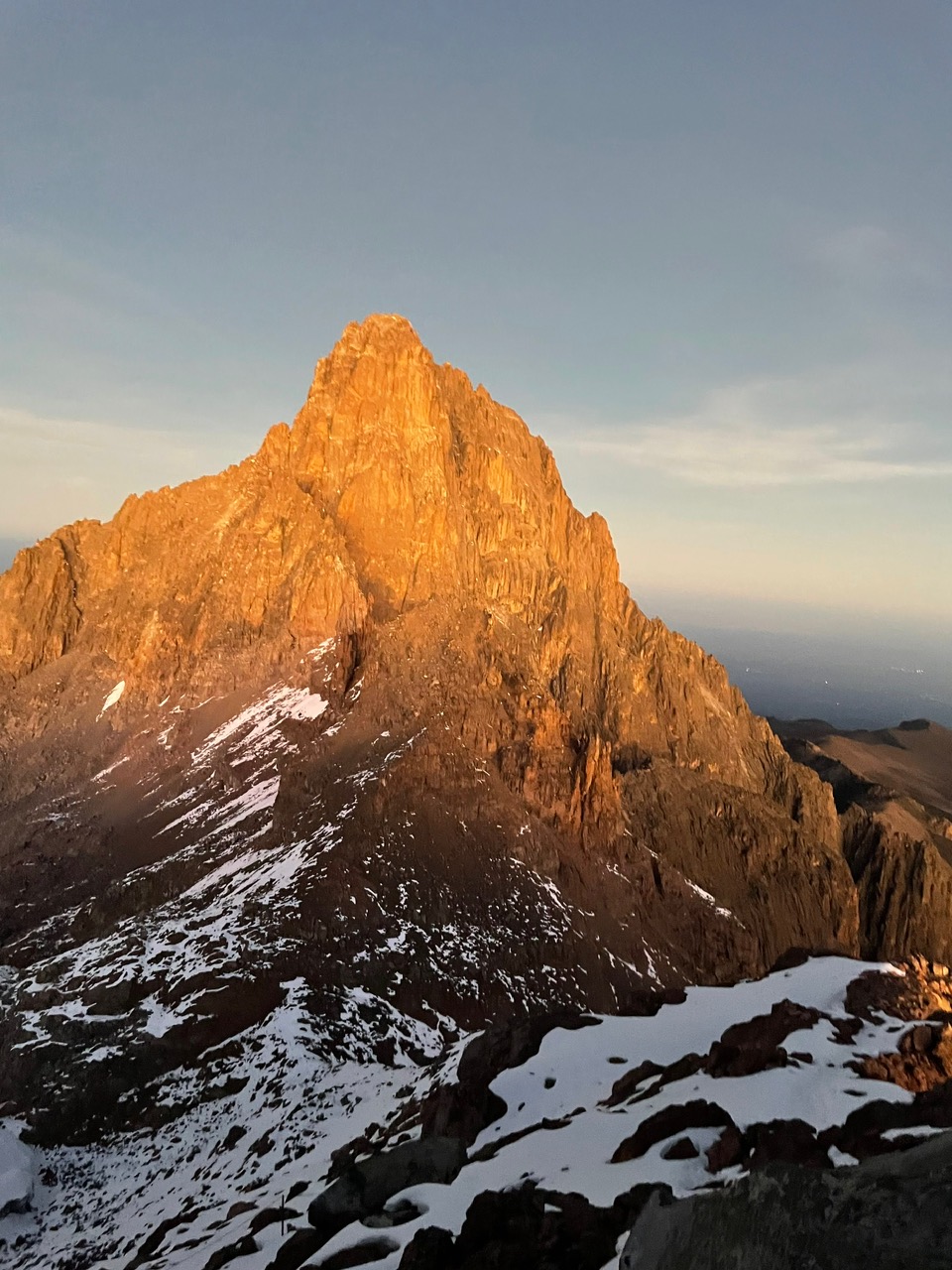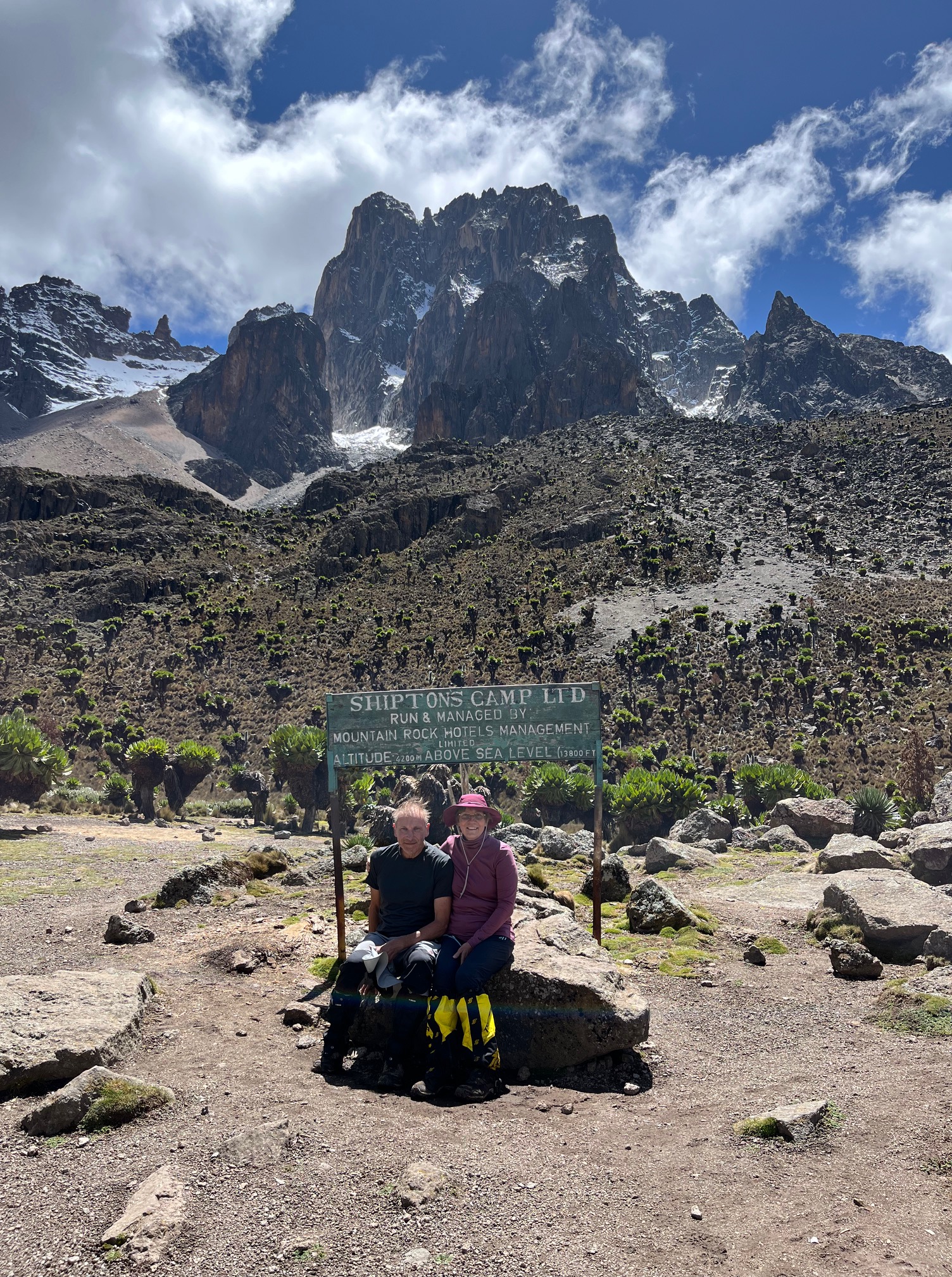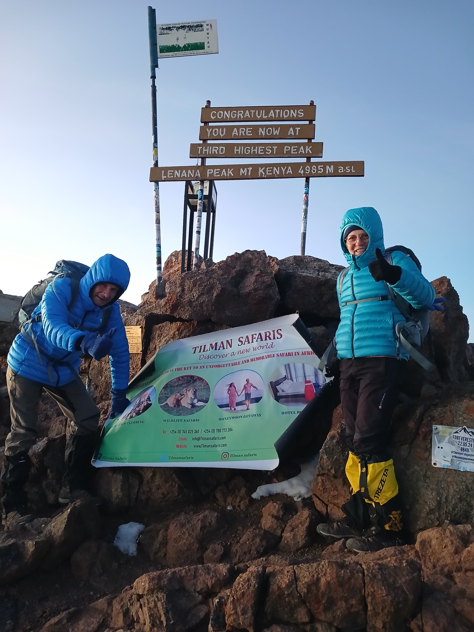 Um halb drei Uhr wurden wir „geweckt“ , das Frühstück war super gut und wir bekamen noch einen Wundertee mit Ingwer, Zitrone und Knoblauch mit, eine Bombe, phänomenal. Sie fragten uns auch schon wegen der Lunchpackete für den Abstieg zum Old Moses Camp. Etwa um fünf nach drei Uhr standen wir vor dem Schild vom Shiptons Camp mit den eingeschaltenen Stirnlampen , Stöcke, warm eingepackt, leichte Rucksäcke. Die wichtigsten Utensilien dachten wir uns werden wohl die Grödeln sein, denn ab viertausendfünfhundert Meter liegt noch reichlich Schnee, der auch vereist sein müsste, wir haben ja konstant unter null Grad. Bernard sagte uns schon gestern beim Briefing, dass wir uns an seinem Rythmus halten mussten. Er erklärte uns die drei Teilstrecken, die man von unten nicht genau ausmachen konnte. Die erste war eher wenig steil in vier Serpentinen bis zu einem kleinen Vorgipfel. In sehr langsamen Schritten schlängelten wir uns also hoch. So zu gehen sind wir einfach nicht so gewonht, ich beobachtete Marion, wie sie mehrmals bremsen musste, um nicht Bernard in den Fersen zu treten. Ich tüftelte mir eine Technick aus, mit der ich dann zurecht kam. Ich hielt mich so weit zurück, wie der Lichtschein meiner Lampe reichte, so konnte ich immer einige Schritte rangehen und wieder warten. Die zweite Teilstrecke wurde dann etwas steiler mit etwas Lavageröll und darunter Eis. Wir wandelten wie mondsüchtige an einem Grat entlang. Unter uns in einer Mulde ein See, von dem wir aber wegen der Dunkelheit nur die Umrisse erkennen konnten. Es kam mit vor, wie in einem alten Schwarzweißfilm mit Luis Trenker. Weiter unten sehen wir auch die zwei Lichter der Spanierin und ihrem Guide, die einige Minuten nach uns gestartet waren, ein zwei Mal ruften sich die Guides auch zu. Dann ging es ohne Pause etwas steiler die Südostwand des Massivs hoch , rechts leuchteten die Ausläufer der beiden Gletscher in bizarren Farben wie Diamanten. Bei den Anblicken hier habe ich ganz vergessen auf welche Höhe wir uns befinden. Ich bewege mich wie in einem Flow,einfach nach oben, ohne daran zu denken. Hinter einem Felsturm leuchtete plötzlich der Batian 5199m mit seiner ganzen Größe vor uns. Da er höher ist,wird er schon vom Sonnenlicht in einem leuchtendem Rot beleuchtet. Jetzt kann man auch zu unserer Linken die Fahne am Gipfel des Point Lenana erkennen. Mit etwas schwierigeren Blockkletterei geht es weiter hoch, da geht Bernard kurz zur Seite und Marion lässt sich nicht bitten, sie übernimmt die Führung, jetzt sind wir in unserem Element, da die Route gut auszumachen ist geht es jetzt eher zackig. Marion ist gut beim Wählen der richtigen Stützpunkte und Griffe, dann stehen wir urplötzlich vor einem Schild : “ Via Ferrata Olonana , highest ferrata in the World“ ? “ Na ja “ , denken wir beide. Von da aus geht man über drei Steigeisen über eine Felsmauer hoch, dann ist man auf dem Gipfel des Point Lenana 5985m. Es ist zehn vor sechs Uhr, bis zum Sonnenaufgang dauert es noch eine knappe halbe Stunde, doch vorerst mal sind wir beide schon etwas emotional berührt, es überkommt einem einfach, wenn man diese Weite vor sich hat. Zudem der rote Horizont um uns herum, wie in einem Traum. Ich habe Marion ein paar mal fest gedrückt, eigentlich nicht um sie zu umarmen, nein, ich wollte wissen, ob ich wohl etwas spüre, ja ich spürte etwas also war es wahr, dass wir hier standen. Beide standen wir stabil ohne zu taumeln, am Gpifel war auch genügend Platz. Dann Fotos, Fotos, Fotos und so weiter. Das Panorama hier war schon schöner als am Mount Meru, da ringsum schon ein Massiv und ein Hochland mit mehreren Gpifeln zu sehen ist. Dann bekommen wir noch die Glückwünsche von Bernard. Beim Foto mit dem Banner von der Tilmanns Tour, tun wir uns schwer, den gerade zu halten, der Wind macht sich immer mehr bemerkbar. Noch ein paar Minuten hier um alles auf unseren Rechner ( Im Gehirn, wenig giga) zu speichern.