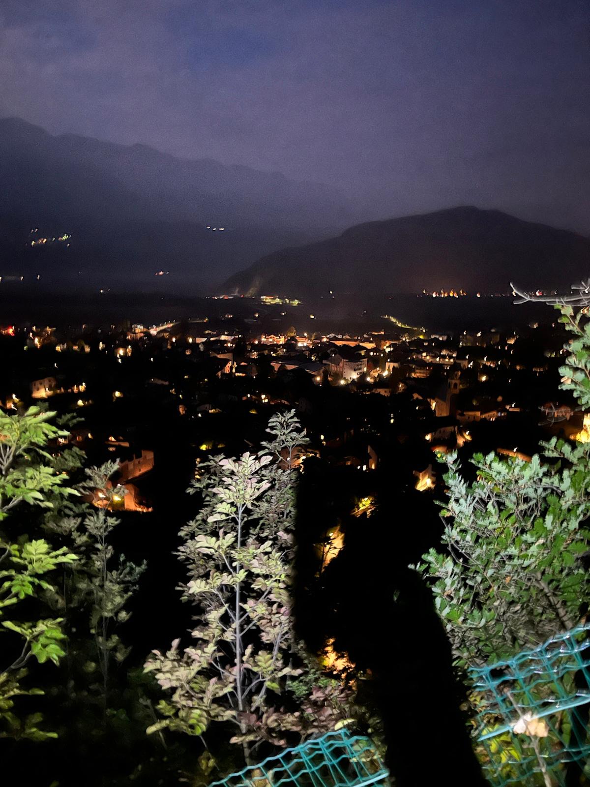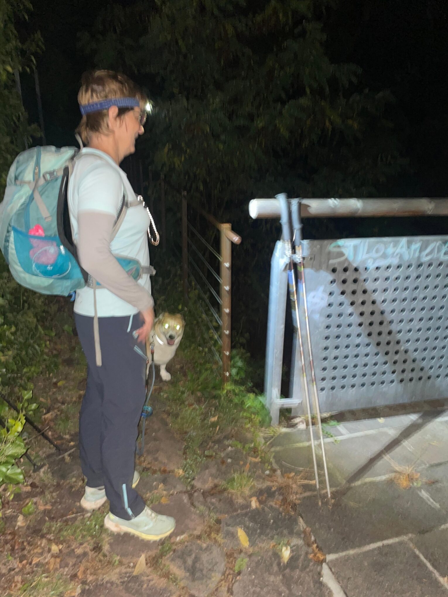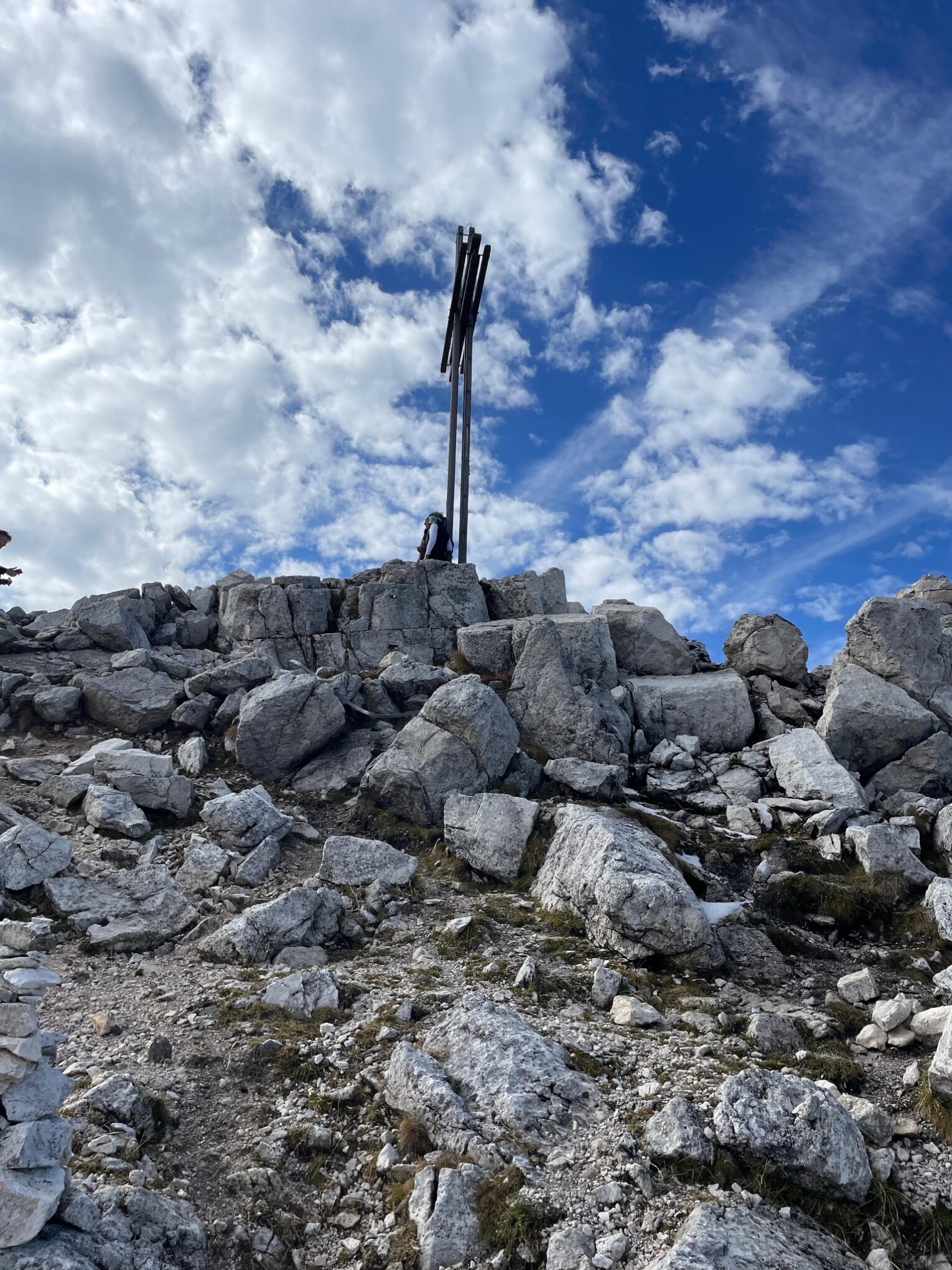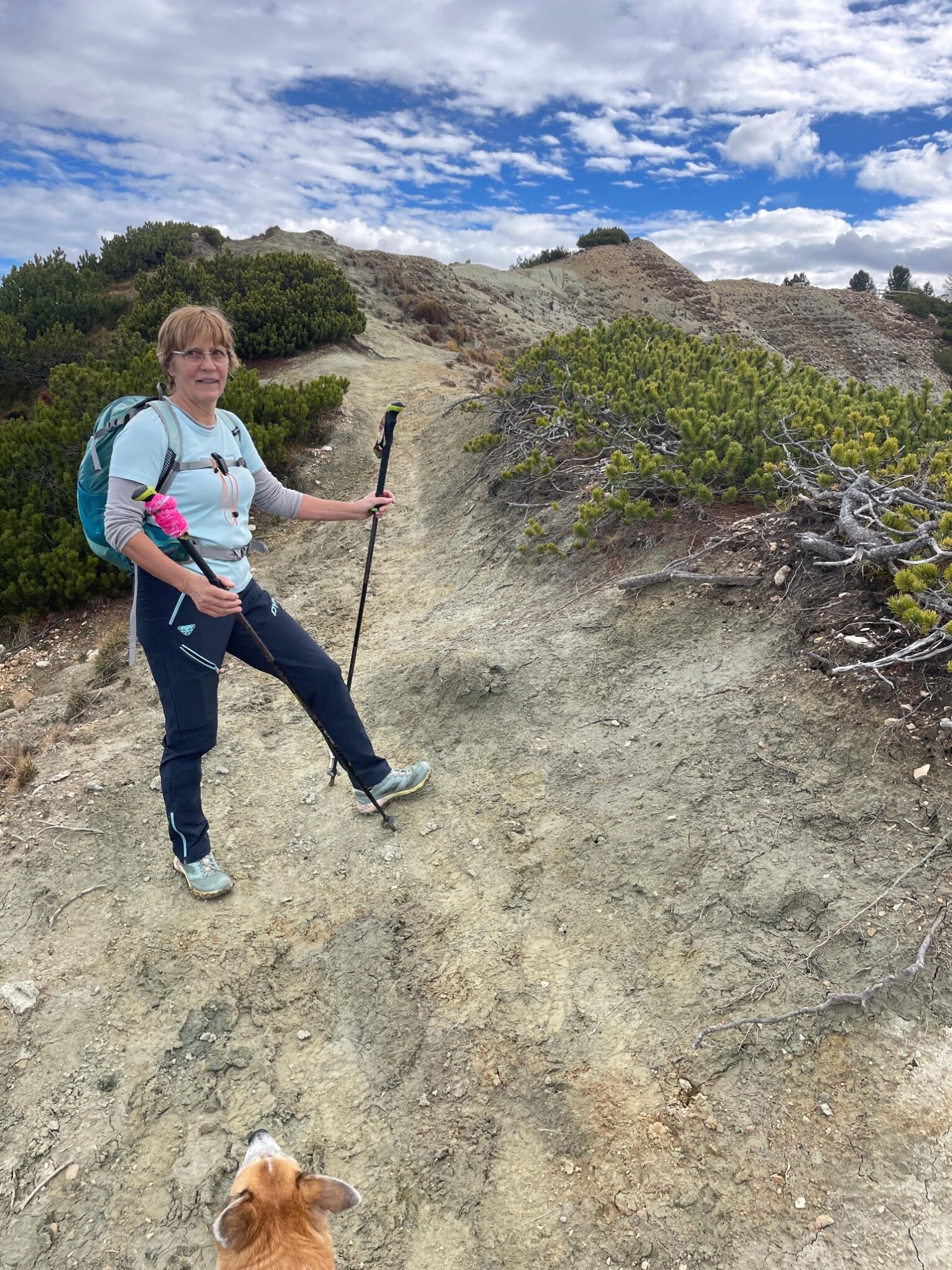 Start um zehn nach sechs bei Dunkelheit. Wir haben ja neue Stirnlampen für unsere große Tour im November besorgt und auch schon beim Sonnenaufgang auf dem Weisshorn getestet. Es geht über die Katzenleiter, Steig Nr 1 mal gleich zur Sache, steil natürlich. Ich bin volle im Flow, wie man sagt und schiesse mal los. Die Marion mahnt mich aber: „So pock i net zwoatausnd Hönmetr i kimm lei bis Matan“, sie hatte schon recht und ich drosselte gleich das Tempo, Lady war es egal sie war topfit. Dann weiter bis Aldein immer den Steig 1 folgend. Es ist schon etwas besonderes, wenn man so früh unterwegs ist und verfolgen kann, wie alles um uns herum langsam aufwacht. Die brennenden Lichter in den Häusern oder auch die nicht brennenden verraten uns die Gewohnheiten der Bewohner , Lieferwagen von den Bäckern kann man von oben verfolgen, wo sie liefern, es kommen dann die Müllwagen. Um acht Uhr gehen wir schon durch Aldein, zwei Gemeindeangestellte, beide mit einem frischen „Panino mit Mortadella?“ vom Dorfladen in der Hand starten gerade mit Ihrem Piaggio Kleinlaster und winken uns zu, einfach; toll. Jetzt wechseln wir auf den Steig Nr 11, der zum Geopark Bletterbachschlucht führt. Nach dem „Wöser“ steigen wir links hoch und über den breit angelegten E5 Wanderweg und erreichen wir dann endlich eines unserer wichtigen Ettappenziele: Den Kösertalsattel auf zirka 1700m. Alle drei sind wir froh, eine Pause einzulegen. Marion und ich wechseln mal ein paar Kleigungstücke, beim Aufstieg haben wir schon geschwitzt. Lady bekommt eine Ration, wir stärken uns auch mit einem warmen und sehr süssen! Holersaft eine gute Kaminwurze mit Brot ( Kohlenhydrate), wo sich auch die Lady gerne beteiligt. Gestern habe ich uns leckere Fruchtriegel besorgt, die werden auch gleich getestet: Vorzüglich. Es ist jetzt zehn nach zehn. Am Wanderschild steht: Weisshorn eine Stunde und vierzig Minuten, das heisst dann, dass wir kurz vor zwölf Uhr oben sein müssten. Meine Berechnung war so um halb zwölf, das wäre ja perfekt, danke ich mir. Unter normalen Umständen sind wir aufwärts schon meist schneller als angeschrieben, aber ob das auch nach zurückgelegten 1400 Höhenmetern noch so ist, wissen wir heute nicht. Na dann mal los über den breiten Forstweg anfangs sind wir schon eher flott drauf, dann geht der eigentliche Gipfelanstieg über den Steig Nr 5 los, da kommen Serpentinen und steile Passagen bis zum Grat von der Bletterbachschlucht. Marion geht voraus und ist erstaunlicherweise noch mega gut drauf. Lady läuft gut gesichert zwischen uns. Dann ab dem Grat kommen ein paar mit Drahtseil gesicherte Stellen, dort packen wir dann unsere Stöcke ein. Sie sind ab hier schon eher ein Hindernis. Dann kommt die Schlüsselstelle, wo man schon vorsichtig sein muss. Kurz vorher wird noch einmal der Puls komplett beruhigt. Dann klettern wir über diese kurze gesicherte Rinne hoch. Bei den fast veritkalen Stellen bemerken wir schon, dass es nicht so leicht geht ,wie beim normalen Aufstieg. Doch wir erreichen den Gipfel mit ruhigem Atem ohne Hyperventilation, die kommt aber bei Marion doch aber vor lauter Freude, die über 2000 Höhenmeter geschafft zu haben. Lady freut sich natürlich mit uns und jodelt auch gleich. Alles super gelaufen, es ist jetzt elf Uhr und siebzehn Minuten. Doch so wie wir uns das vorgestellt haben, knapp über 5 Stunden für die ganze Strecke. Am Gipfel ist es gar nicht so warm, es wird alles angezogen was wir mithaben, dann Fotos, wie immer, heute bleiben wir auch etwas länger hier. Es sind auch noch ein paar Wanderer vom Pass aus hochgekommen.